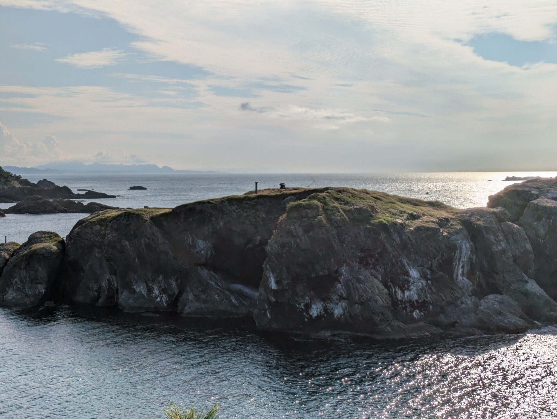 以下は、逆光でHDR+撮影した海の写真です。作例1と同様に、白とびが抑えられています。ただし、全体的に画質が粗く、岩場の輪郭が滲んでいます。