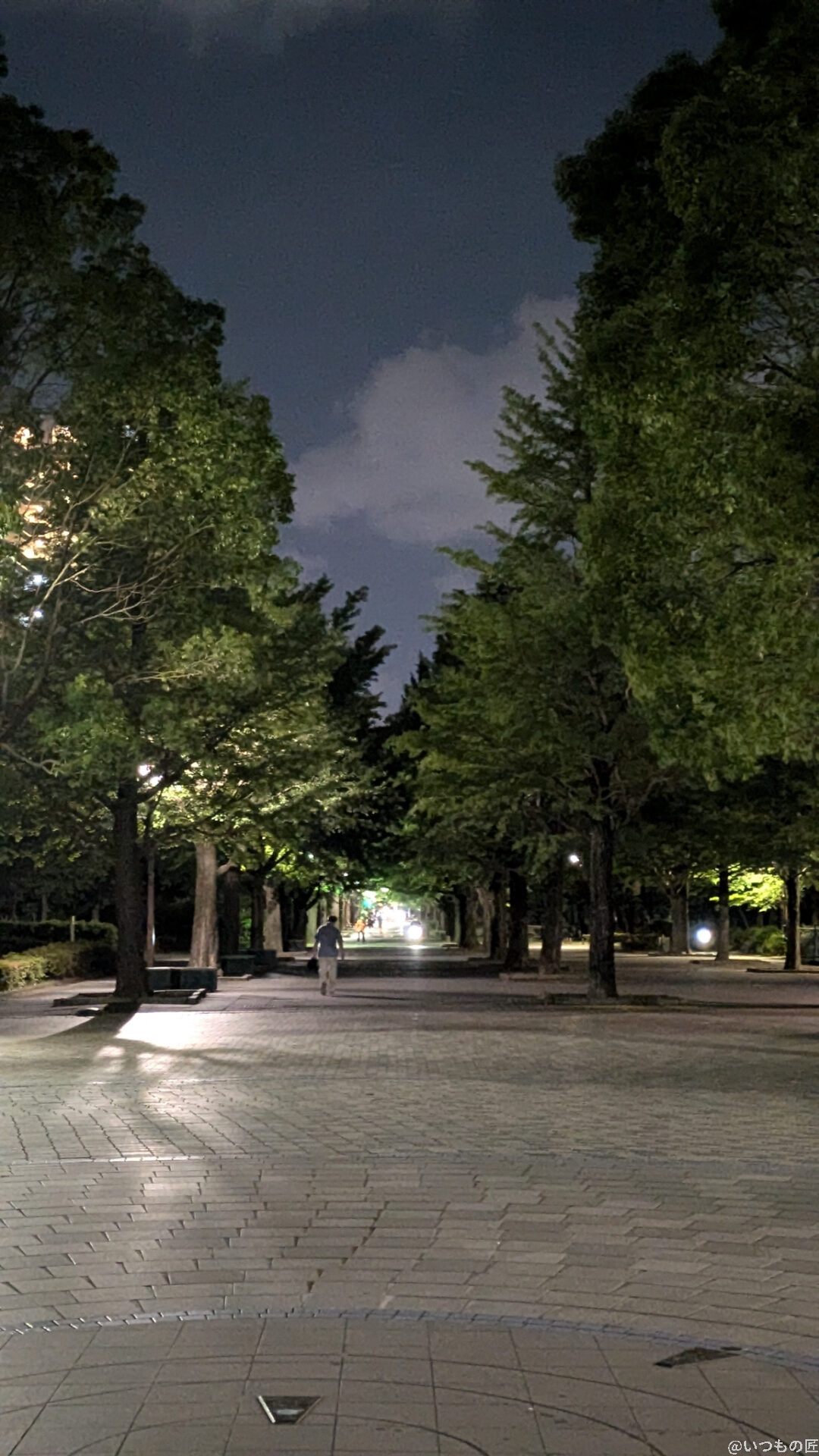 以下は、公園で暗所撮影した写真です。画質が粗く、ライトの影響による白とびが目立ちます。