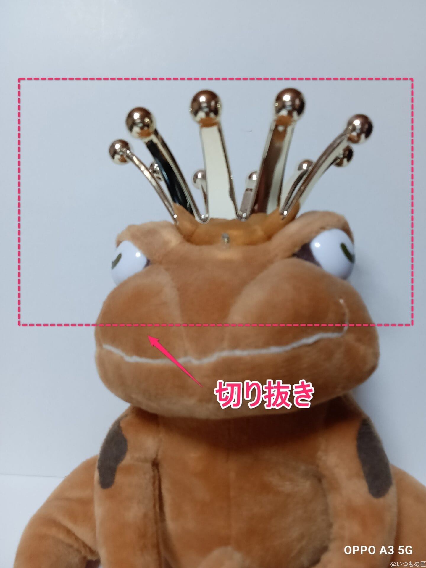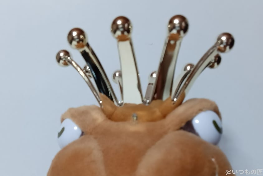 以下は、室内でインカメラ撮影したぬいぐるみの写真です。王冠と背景の境目の処理が甘く、ぼやけています。